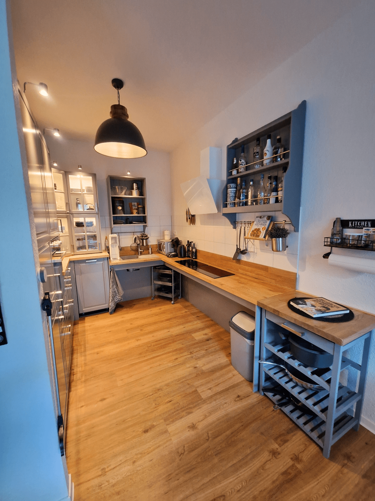 Die Auswahl und die Ausstattung der rollstuhlgerechten Küche erforderte sehr viel Zeit und Ideenfindung, um optimal auf die Bedürfnisse eines*einer Rollstuhlfahrer*s*in abgestimmt zu sein. Zum Teil hat Jonas einen Zuschuss über die Pflegekasse erhalten (Wohnraumanpassende Maßnahme bis zu 4.000€ Zuschuss insgesamt).