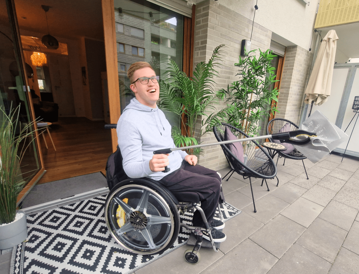 Die Greifzange hilft Jonas während seiner assistenzfreien Zeit, heruntergefallene Gegenstände aufzuheben oder andere, schlecht erreichbare Dinge, mit Hilfe der Greifzange zu bewältigen.