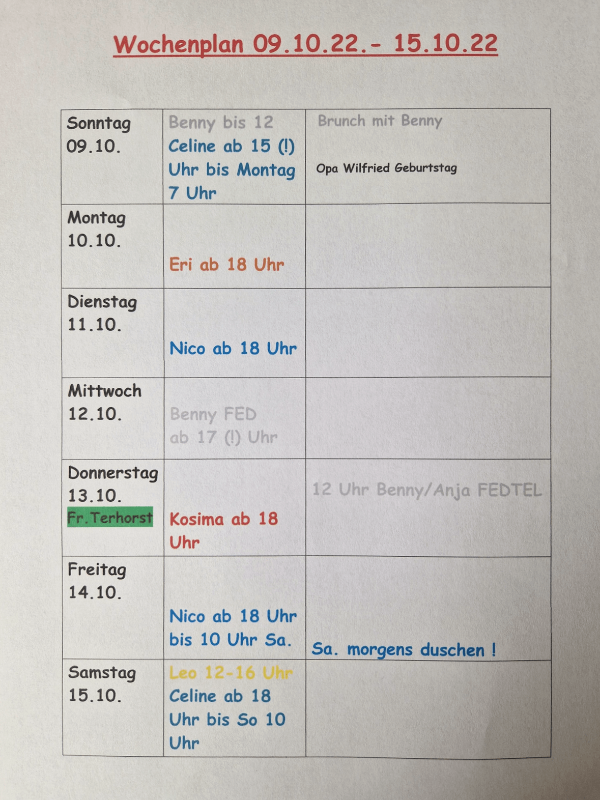 Die Dienstpläne erstellen wir stets übersichtlich gemeinsam mit Jonas entsprechend seiner Wünsche  im Wochenrhythmus, wobei jede*r Assistent*in seine eigene Farbe als Wiedererkennungswert bei Jonas hat.