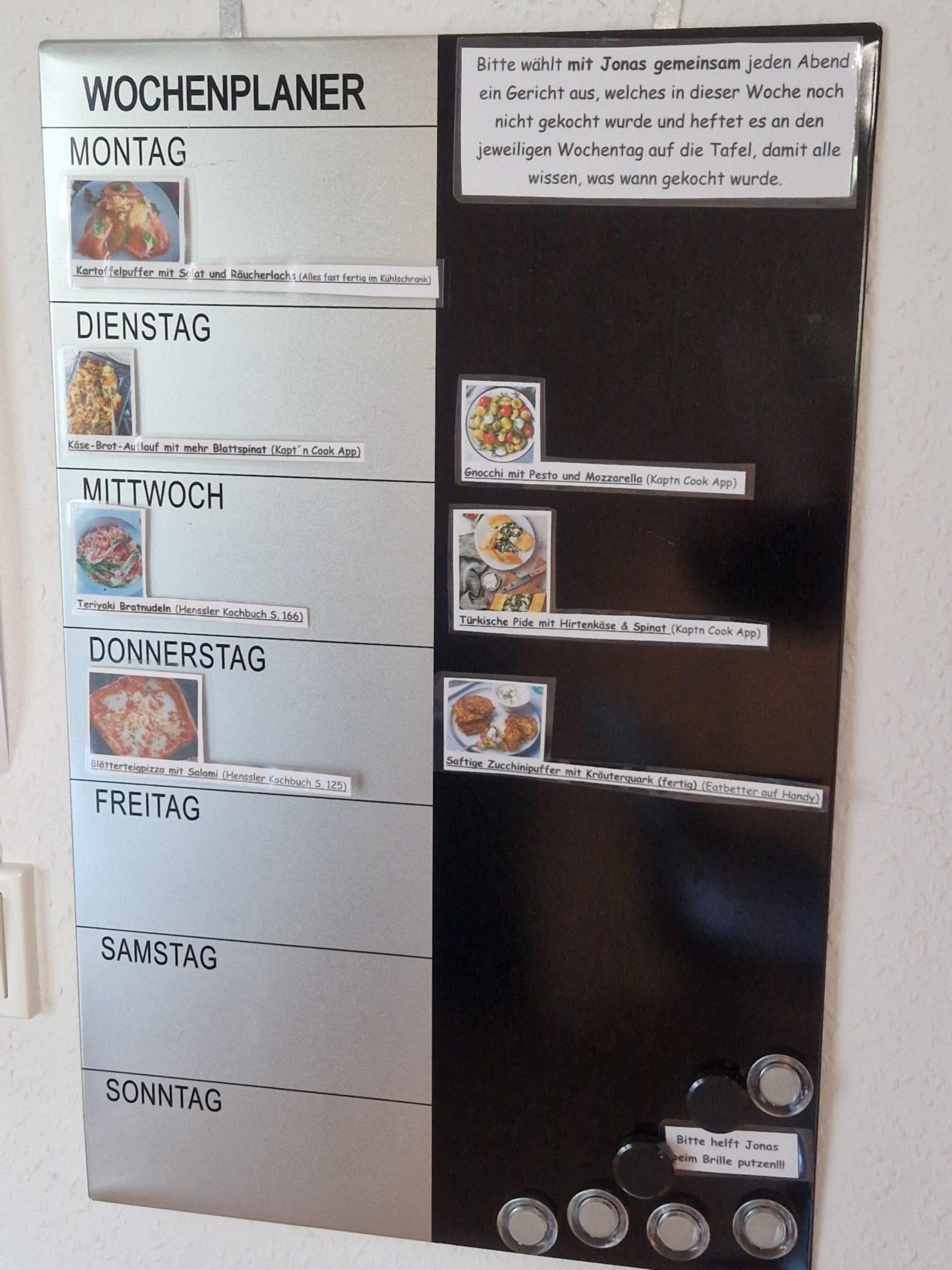 Darüber hinaus gibt es einen Wochenplaner für die Mahlzeiten. Hier sucht sich Jonas aus einem Portfolio von mittlerweile 30 Gerichten aus, was er in der aktuellen Woche an 5 Tagen  mit seinen Assistent*innen kochen möchte. Das jeweilige Gericht, das gekocht wurde, wird dann an den Wochentag geheftet, damit jeder weiß, was wann bereits gekocht wurde. Dementsprechend wird am Wochenanfang bei den Fachleistungsstunden die Einkaufsliste erstellt und die Lebensmittel online bestellt oder gemeinsam eingekauft.